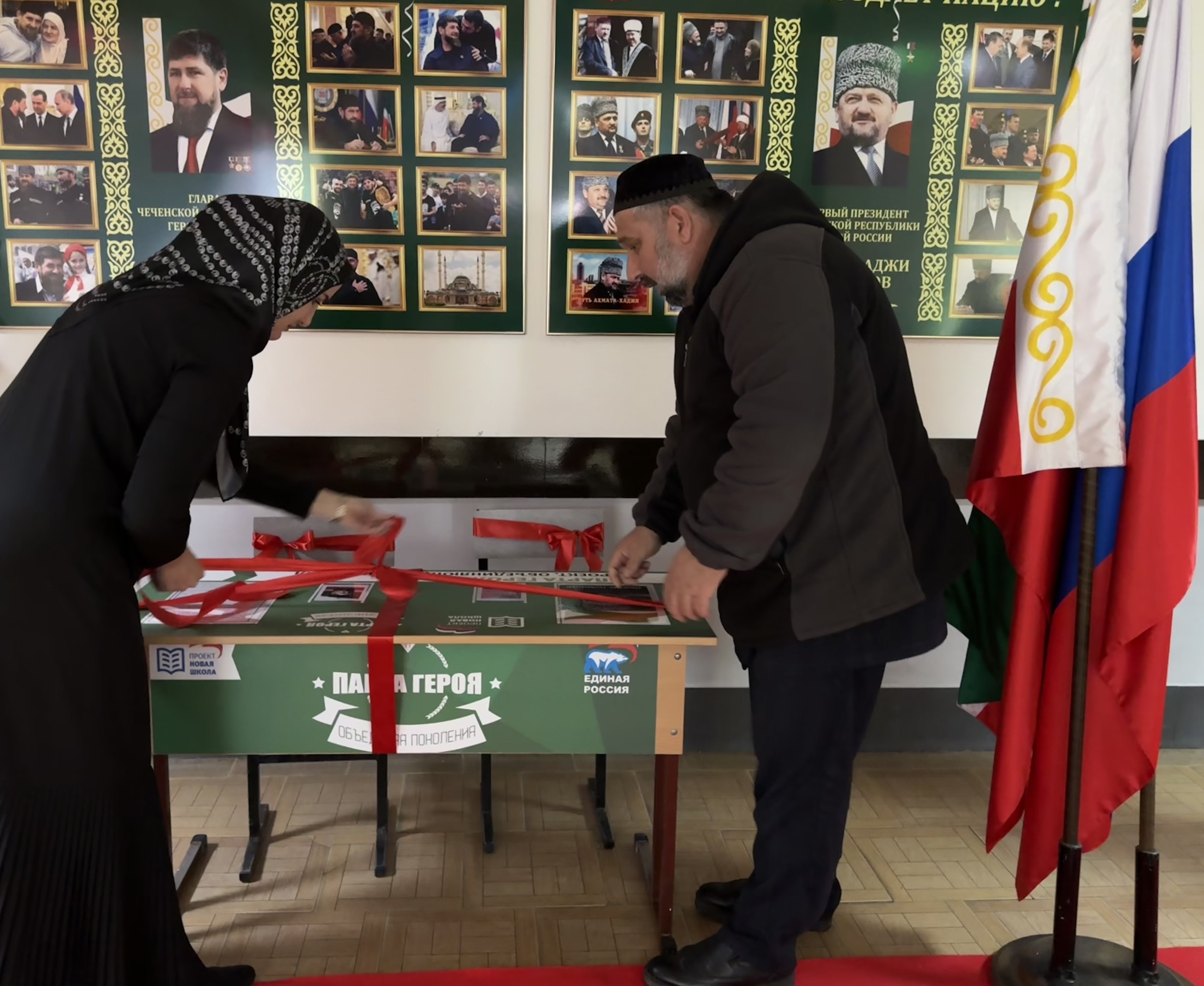 «Парта Героя» — ученический стол с размещенной на нем информацией о заслугах, биографии и фотографией Ахмата-Хаджи Кадырова (Дала г1азот къобала дойла цун).
